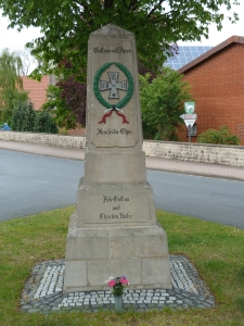 Saniertes obeliskartiges Denkmal aus Stein am Ortseingang aus Richtung Harsum im Bereich Lange