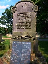 Denkmal für die Gefallenen des 1. und 2. Weltkriegs vor der Kirche, verzierte Sandsteinwand für die Gefallenen des 1. Weltkriegs mit später davor angebrachter Granittafel mit den Namen des 2. Weltkriegs; Kriegsgräberstätte auf dem Friedhof