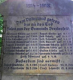 1.Weltkrieg Rückseite: 1914-1918 Dem Vaterland getreu bis an den Tod fielen aus der Gemeinde Breitenfeld (Namen) Außerdem sind vermisst: (Namen)