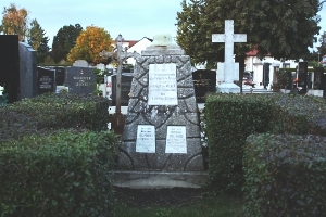 Im Friedhof; gemauertes Denkmal, oben mit Stahlhelm, vorne drei Tafeln