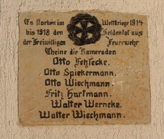 Buchstaben; Kleine Tafel am Feuerwehrhaus neben der Kirche; Ehrenliste für die Gefallenen des