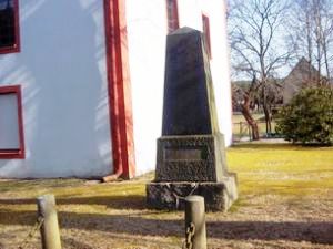 Vor der Kirche steht ein Granitobelisk.