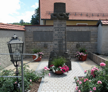 eingelassene Tafeln tragen die Namen der Opfer beider Weltkriege, die vorgelagerte Säule die Inschrift.