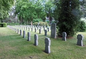 Quelle www.volksbund.de: Hier ruhen 201 Opfer beider Weltkriege. 1993 wurde mit Unterstützung der Bundeswehr eine neue Anlage für die 33 gefallenen deutschen Soldaten des 2. Weltkrieges geschaffen und 1994 das Gräberfeld für die Toten des 1. Weltkrieges neu gestaltet. Hier befinden sich auch Ehrenhaine für 132 Soldaten anderer Nationen. An der Ostmauer des Friedhofes erinnert eine Stele an 14 KZ-Häftlinge, Opfer eines Marsches im April 1945.