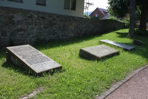 entfernt davon liegende Steinplatten, eine mit Namen und eine mit Inschrift