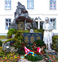 1914 – 1918 Den Helden der Heimat. (Namen) Ruhet sanft, ihr tapf'ren Krieger, Nie kehrt Ihr in Eure Heimat wieder! Da Ihr gekämpft für's Vaterland Steht Euer Lohn in Gottes Hand! In pflichtgetreuer Erinnerung von Euren Kameraden. 1939 – 1945 (Namen)