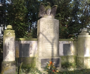 Denkmal für die Gefallenen des 1.Weltkriegs auf dem Friedhof: geflügeltes Denkmal mit krönendem Adler; KZ-Opfer-Grab; Gedenktafel für die Kriege 1864-1871 in der Kirche.