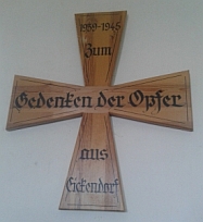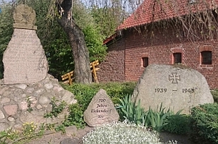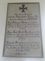 Denkmal für die Gefallenen des 1. Weltkrieges vor der Kirche, Feldsteinpyramide mit aufgesetztem Findling und krönendem EK, beigestellt ein Feldstein für die Gefallenen des 2. Weltkriegs; Gedenktafeln und Gedenkkreuz in der Kirche