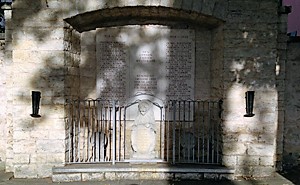 Mahnmal an der Friedhofsmauer zwischen Kircheneingang St. Johannes d. Täufer und Pfarrhaus. In einer aus Natursteinen aufgemauerten Apsis drei Tafeln aus Treuchtlinger Marmor.
