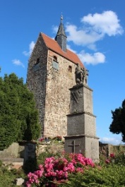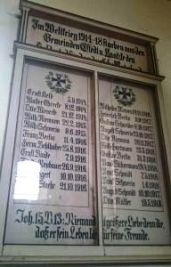 Quadratisches Denkmal vor der Kirche, dessen Stufen sich nach oben verjüngen. Namen, Symbole und Inschriften (auf der Wetterseite teilweise verwittert) an den Seiten, oben ein Soldat ohne Helm mit Kind; Gedenktafeln in der Kirche