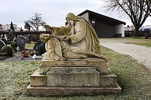 Felldorf (Friedhof), Gemeinde Starzach, Landkreis Tübingen, Baden-WürttembergPLZ 72181 Im Friedhof; Steinplastik auf einem Sockel "Jesus segnet gefallenen Soldaten", (ohne Inschrift, ohne Namen).
