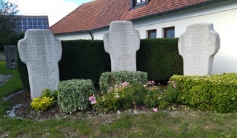 Drei in Kreuzform gestaltete Steinstelen bei der evangelischen Kirche.