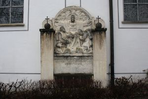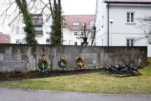 An der kath. Stadtpfarrkirche; Denkmal oben mit Bildrelief, an den seitlichen Säulen Namen (Weltkrieg 1), vor der Kirche; Gedenkwand mit Namen und Kreuzsymbolen, davor Dornenkranz (Weltkrieg 2); zusätzlich Hinweise zu Soldaten von privaten Gedenksteinen