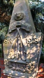 gekreuzte Gewehre zeigt. Heute ist die Stele verkürzt und es wurden seitlich neue Steintafeln mit den