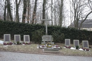 Auf dem Gelände des Friedhofs stehen rechterhand sechs Tafeln mit den Namen verstorbener
