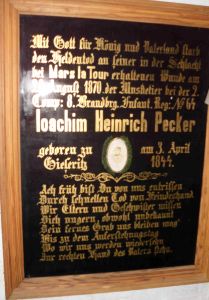 Tafel: Mit Gott für König und Vaterland starb den Heldentod an seiner in der Schlacht bei Mars la Tour erhaltenen Wunde am 28. August 1870 bei der 2.Comp. 8.Brandbrg.Infant.Reg. No.64 Joachim Heinrich Pecker geb. zu Gieseritz am 3.April1844 Ach früh bist du von uns entrissen, durch schnellen Tod durch Feindeshand. Wir Eltern und Geschwister missen dich ungern, obwohl unbekannt dein fernes Grab uns bleiben mag, bis zu dem Auferstehungstag wo wir uns werden wiedersehn. Zur rechten Hand des Vaters stehn.