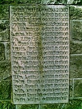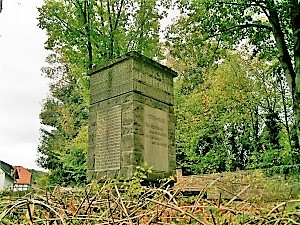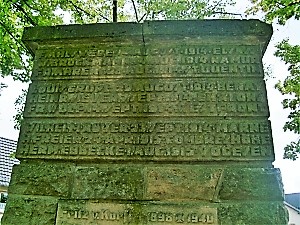 Stufen, steht ein wuchtiger Sandsteinquader. Oben auf dem Denkmal stehen rundherum die Namen der