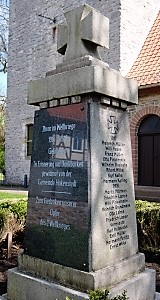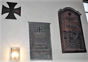 Stele bei der Kirche (mit krönendem Eisernen Kreuz) Die Widmungstafel wurde offensichtlich nachträglich angebracht; Gedenktafeln in der Kirche; Gedenkjen auf Familiengräbern