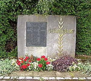 Friedhof / Stein mit Metalltafel / Inschrift der Gemeinde / mit den Namen beider Weltkriege
