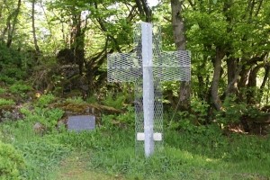 Heidelstein (Grenzöffnung), Stadt Bischofsheim i.d.Rhön, Landkreis Rhön-Grabfeld, Unterfranken, BayernPLZ 97653 Auf dem Ostgipfel des Heidelsteins, direkt neben dem Denkmal des Rhönklubs: Kreuz aus Draht von dem ehemaligen Grenzzaun, Gedenktafel an einem Stein