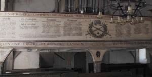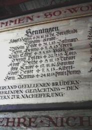 Empore Kirche: 1914 – 1918 (Stahlhelm, Schwerter, Eichenkranz, Eisernes Kreuz) Ist unsere Zeit gekommen so wollen wir ritterlich sterben um unserer Brüder Willen und unsere Ehre nicht lassen zu Schanden werden. Den im Weltkrieg für das Vaterland gefallenen Brüdern unserer Kirchengemeinde zum ehrenden Gedächtnis – Den kommenden Geschlechtern zur Nacheiferung. (Namen Henningen und Nachbarorte)