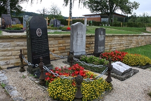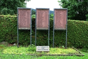 a) Im Friedhof; drei Gedenktafeln und davor ein Gedenkstein, b) im Friedhof; Kriegsgräber