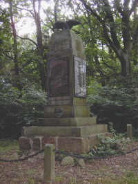Am Dorfanger zwischen Bäumen eine ca. 3,5 m hohe Stele auf vierstufigem treppenförmigen Sockel;