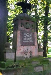 Denkmal im Park am Ortsrand, gekrönt von einem Adler (ohne Namen), Gedenken auf Familiengräbern. Ehrenliste für die Gefallenen des 1. Weltkriegs.