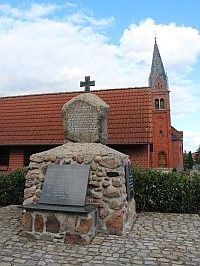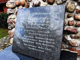 Vor der Kirche ein Quader aus Feldsteinen gebaut, oben ein Findling mit den Namen der Gefallenen aus dem 1. Weltkrieg, davor ein Podest mit Gedenktafel für die Gefallenen aus dem 2. Weltkrieg; rechts eine Tafel mit Inschrift. Ehrenliste für die Gefallenen des 1. Weltkriegs.