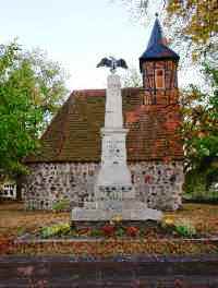 Vor der Feldsteinkirche: Stele mit einem Adler mit ausgebreiteten Schwingen auf einer Kugel. Ehrenliste