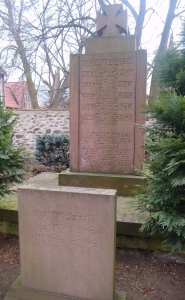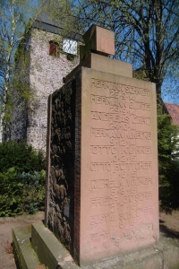 Denkmal für die Gefallenen des 1. Weltkriegs vor der Kirche. Roter Sandsteinblock mit krönendem EK. Davor später aufgestellter Steinblock für alle Kriegsopfer.