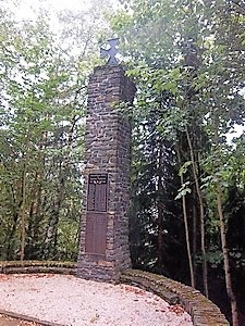 Feldstein gemauertes Denkmal. Oben mit Eisernem Kreuz vorne mit zwei Tafeln für die Gefallenen