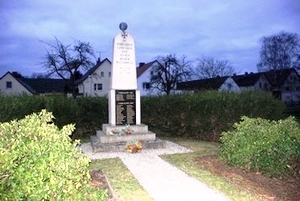An der Dorfaue steht ein Obelisk aus hellem Granit mit Widmung und Namenstafel