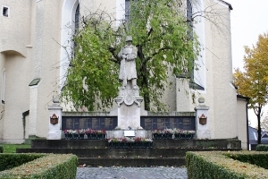 Bei der Kirche; Gedenkwand, in der Mitte vorspringend und erhöht, oben mit Steinplastik "Soldat mit Gewehr"; seitlich vom Denkmal ein Stein, oben mit Feuerschale, vorne Messingtafel; zusätzlich Hinweise zu Soldaten von privaten Gedenksteinen