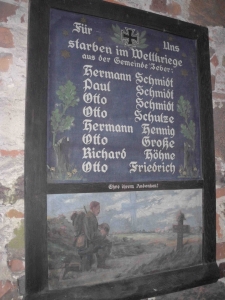 Gedenktafel für die Gefallenen des 1. Weltkriegs in der Kirche in Hundeluft. Kriegsgräber auf dem Friedhof von Jeber