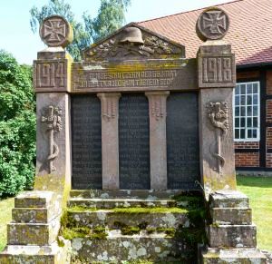 Jeggau, Stadt Gardelegen, Altmarkkreis Salzwedel, Sachsen-AnhaltPLZ 39649 Vor der Kirche 2 Denkmäler, Denkmal für die Gefallenen des 1. Weltkriegs aus rotem Sandstein mit vielen Verzierungen und eingelassenen Namenstafeln; Denkmal für die Gefallenen des 2. Weltkriegs, schlichte aufgerichtete Granitplatte; Gedenktafeln in der Kirche