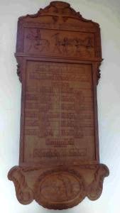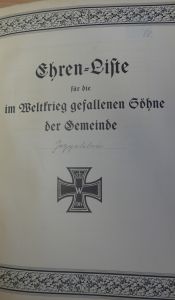 Gedenktafel für die Gefallenen des 1. Weltkriegs und Gedenkbuch für die Gefallenen des 2. Weltkriegs in der Kirche; Ehrenliste für die Gefallenen des 1. Weltkriegs; Gedenken in der Chronik des Nachbarortes Badel