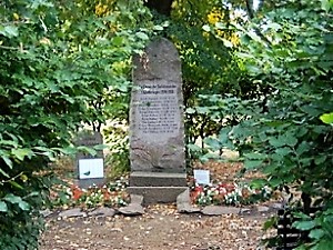 Links davon ein halb so großer Stein mit einer weißen Plastikplatte (2. Weltkrieg). Rechts