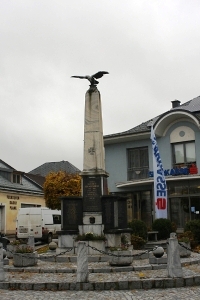 Am Marktplatz; Säule oben mit Adler, und unten Gedenktafeln (Weltkrieg 1), an jeder Ecke je eine angesetzte Marmortafel (Weltkrieg 2); zusätzlich Hinweise zu Soldaten von privaten Gedenksteinen