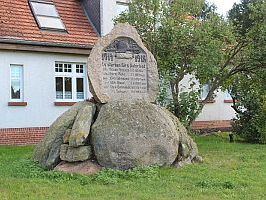 Gegenüber der kleinen Feldsteinkirche ein Denkmal aus aufgetürmten Findlingen, im oberen wurden die Namen der Gefallenen des 1. Weltkrieges eingesetzt. In der Kirche Empore beschriftet mit Widmung und Namen für die Gefallenen beider Weltkriege. Ehrenliste für die Gefallenen des 1. Weltkriegs.