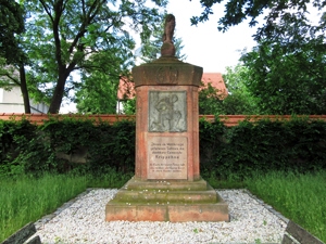 Ein Löwe krönt das rötliche Steindenkmal für den 1. Weltkrieg in Sichtweite der Kirche. Einzelgedenken für einen Gefallenen des 2. Weltkriegs auf dem Friedhof.