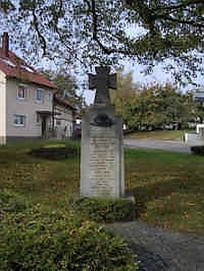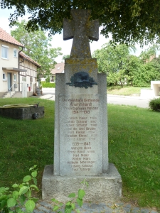 Das Kriegerdenkmal befindet sich in der Ortsmitte unter einer stattlichen Linde. Der Gedenkstein trägt ein aufgesetztes Kreuz und oberhalb der Namen das Bild eines Stahlhelms mit Seitengewehr und Zweig mit Blättern.