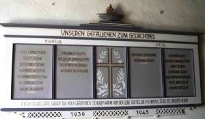 Tafel 2. Weltkrieg: Unseren Gefallenen zum Gedächtnis (Namen) Ich bin gewiss, dass weder Tod noch Leben mich scheiden kann von der Liebe Gottes, die in Christus Jesus ist unserm Herrn 1939-1945