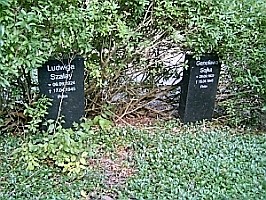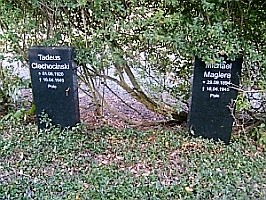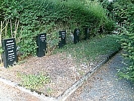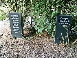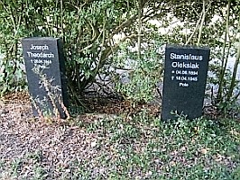Auf dem Friedhof Langelsheim: Eine Reihe Kriegsgräbern vor einer wuchernden Hecke am Friedhofsrand. Neuere Grabsteine auf ungepflegtem Beet. Eingefasst mit Steinumrandung. Laut öffentlichem Ortsratsprotokoll der Stadt Langelsheim v. 8.11.2017 Punkt 5.3. Kriegsgräber, Polengräber genannt