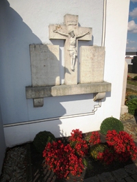 Gedenktafeln zu beiden Seiten des Gekreuzigten für