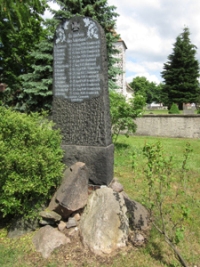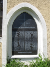 Das schwarze Steindenkmal für den 1. Weltkrieg steht in Sichtweite der Kirche in einer Grünanlage. Der Opfer des 2. Weltkriegs wird auf einer Steintafel an der Kirche gedacht.