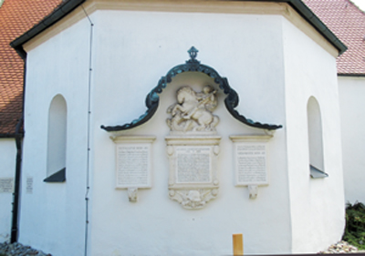 Gedenktafeln an der Außenseite der Kirche unter einem kunstvoll geschwungenen Dach. Ergänzende Angabe von Einzelgedenken auf Privatgrab.