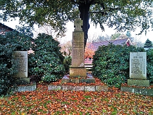 Dreiteiliges Steindenkmal: Stele in der Mitte mit Eisernem Kreuz für den 1. Weltkrieg, rechts und links Steintafeln für den 2. Weltkrieg.