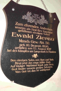 Zum ehrenden Andenken unserm als Held fürs Vaterland gefallenen einzigen Sohne Ewald Zierau Masch-Gew.-Abt.50, geb. 10.Dezemb. 1896, gefallen am 13.August 1917 bei den Kämpfen um Langemark Flandern. Den einzigen Sohn, uns Hort und Starb. Birgt jetzt das enge, kühle Grab. Auf blutger Wahlstatt brach sein Herz. Gott lindre unsern großen Schmerz. Was Gott tut, das ist wohlgetan!