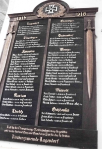 Gedenken für Kriegsteilnehmer 1866-1871 und Gefallene des 1. Weltkriegs auf Tafeln in der Kirche Lagendorf; Ehrenliste für die Gefallenen des 1. Weltkriegs